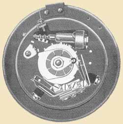 Front view, Siemens No. 8 dial. Note the smaller centre, which carried through onto the earliest No. 10 dials in Britain. The No. 8 dial has four terminals, the No. 10 has five. Rear view: Courtesy Bob Freshwater at http://www.britishtelephones.com/dials/dialfile.html#no8