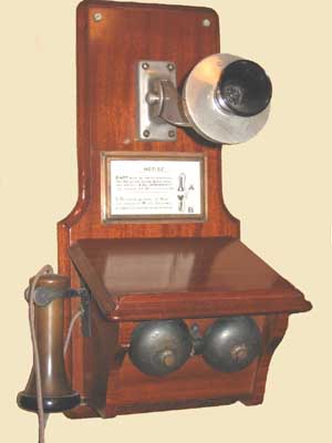 L to R: Fig 5, 3-box wallphone from about 1892 to late 1890s. Fig 6 Model T202 "Long Distance" twin box wall phone with bigger battery case for extra batteries from about 1889; Fig 7 Model T489 CB wall phone from 1895 onwards made to the Western Electric / British Post Office standard pattern. T439 was the same phone fitted with a magneto generator. This phone appears to have a branded transmitter. Photo courtesy Ric Havyatt