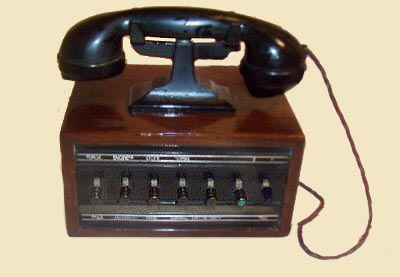 Mike Schult's website at The main drawback of the Dictograph system was the need to install extensive wiring from each position, and businesses were reluctant to change to such an expensive system to replace their tried and tested speaking tubes. Lamson Engineering was a major worldwide provider of office equipment at this time, and added Dictograph to their range of products. The suggestion may have come from Lamsons that Dictograph should rent their systems rather than sell them outright, and spread the buyer's cost over many years. By 1908 Dictograph systems rented from as little as five dollars and fifty cents a month for one master console and five stations. The strategy worked. It was not an original idea. Companies in England such as General Electric had already launched into the rental market in the late 1890s , and the New System Private Telephone Company began in the late 1890s as well. Telephone Rentals began in 1902. The British rental phones were largely supplied by Fuld GMBH in Germany. Fuld was also renting telephones in Germany. Lamsons were well aware of this rental practice through their European companies.. In 1907 Turner traveled to Europe to set up subsidiary firms there. His Dictograph received a lot of favorable attention and the new company he formed repeated its success in Britain, France and Germany. He arranged European rights to manufacture and sell the Acousticon hearing aids as well. On his return to the United States Turner was somewhat embarrassed to find that his factory was falling seriously behind in meeting demand, due to large orders received from the U.S. Government. Another factory was set up in Chicago. In 1910 Turner used the Metrophone to produce the "Detective Dictograph", a slightly larger and even more sensitive microphone intended for surveillance work. It was used by the Burns detective agency to secure convictions in a number of major criminal and graft cases. The courts accepted evidence obtained and recorded by the Detective Dictograph. The resulting publicity on "scientific eavesdropping" encouraged further sales of the intercom systems. The clarity and sensitivity of the microphone was demonstrated in one interview where the person in the remote office could hear the rustling of the journalist's clothing as he moved closer to the Dictograph console. Dictograph microphones were used in the early test radio transmissions of opera by Lee DeForest in New York in 1910. The details of the equipment used by DeForest were widely reported in the technical publications of the time, and the Dictograph units received their share of the publicity. Over the following decades, Dictograph in the United States widened its range to include PAXs, wireless sets and speakers, and military communications equipment. After World War 1 the first handsets appeared on Dictographs. Kelly Turner died on November 7, 1927, a wealthy and respected man. His companies survived him and carried on worldwide, although their direction gradually changed with the changing times. Currently the firm has left the telephone field and supplies security systems. We will now look at Britain, where Dictograph Telephones Ltd's telephone products had their longest run. Although the British phones followed a similar pattern to the U.S. ones, there were local variations. Manufacturing for the British and colonial markets was partly undertaken by Autophone, a subsidiary of the British Home Office Telephone Company, from their factory in Wimbledon. Another factory at Croydon supplied phones, but dates are unknown. Autophone used many imported parts in their construction, mostly brought in once again from H Fuld GMBH. Handsets were branded Dictograph. Fuld later became T&N, and some very late Dictographs have T&N -branded handsets instead. The British part of the construction was mostly the cabinet woodwork and the wiring. Final assembly was eventually moved to a factory in Coventry. Dictograph's association with Lamsons continued, and Lamsons marketed into many colonial markets such as Australia. A rather unusual practice emerged among the rental companies. After a system had been rented for ten years or so, it was scrapped when it was recovered, rather than refurbished and put back in service. This reduced the maintenance load, which was still covered by the rental companies under their contracts, and ensured that the telephones in use remained reasonably modern. Unfortunately it also meant that the early phones are not particularly easy for collectors to obtain. The rental business continued for a surprisingly long time. Dictograph in Britain was still going strong in rentals in 1967, when it was finally taken over by its larger rival Telephone Rentals Dictograph Telephones There are three distinct styles in the Dictograph range, corresponding to pre-First World War, between the wars, and post-Second World War. Although the model numbers are unknown there are few variations. The first pre-War range is distinctive because of its Metrophone transmitter. This is usually mounted behind a decorative Dictograph grille, of which two versions are known (see above). The master consoles had a horn speaker built into the faceplate behind a matching hole. Executive stations and Substations used a compact but efficient watchcase receiver. Master and Executive consoles could handle from 2 stations up to 100 stations and were built in oak or mahogany. An extension loudspeaker could be provided on a station. A system could also be set up as a standard intercom without a master or executive station. Unlike most British intercoms of the same period, Dictograph systems had secrecy between calls.
