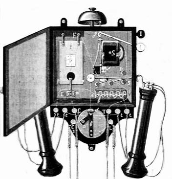 These images are from an early catalog, and show external fittings that are not present on the eBay example. Internally the fittings are much the same, but note the external lightning arrestor at the bottom and the long-pole Bell-style receivers.The dual receivers were a convenient way of reducing background noise while on a call, and boosting the received signal al little. Some Pantelephones were apparently also used in a number of European cities.