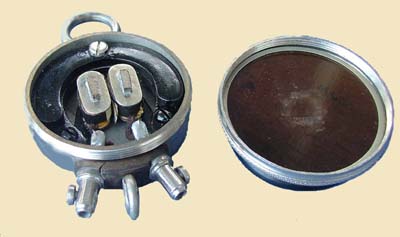 Interior view showing the cork diaphragm and the arm holding the second contact pressing against it. Because of its unusual internal design, it may not readily be recognised as a telephone by collectors who may have one.