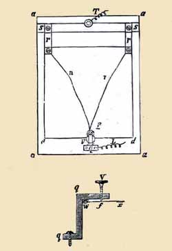 From the few comments available it was a fairly good, sensitive transmitter. It could apparently carry a call for several miles on a single-wire circuit, and a conversation could be picked up twenty metres away from the transmitter. Its sensitivity was due to the large diaphragm area, but this was also a drawback. As can be seen from the photos, the works were covered by a simple fabric screen. This would not have provided much protection to the internals. The transmitter was also sensitive to bumps and knocks, and it would have been impractical to build it into a desk phone. The lower diagram shows the bent metal bracket and adjusting screw that held the contact arm onto the diaphragm. Diagram from "Electricity In The Service Of Man" 1886