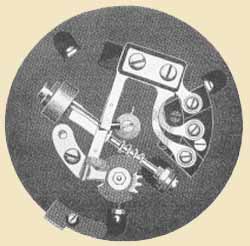 Front view, Siemens No. 8 dial. Note the smaller centre, which carried through onto the earliest No. 10 dials in Britain. The No. 8 dial has four terminals, the No. 10 has five. Rear view: Courtesy Bob Freshwater at http://www.britishtelephones.com/dials/dialfile.html#no8