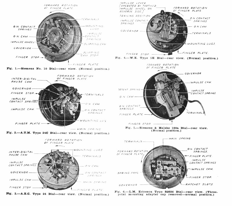 Following this, Australia sourced most of its telephones from Britain. A range of British dials was imported, either built into phones or as maintenance spares. The next illustration is from the Telecommunications Journal of Australia, October 1947, and shows dials used up to that time. The Ericsson dial included a rear protective cap which made it stand out a little further from the phone's surface.