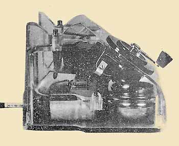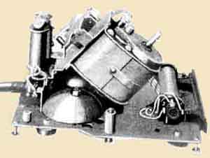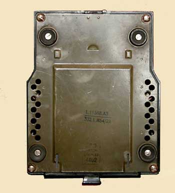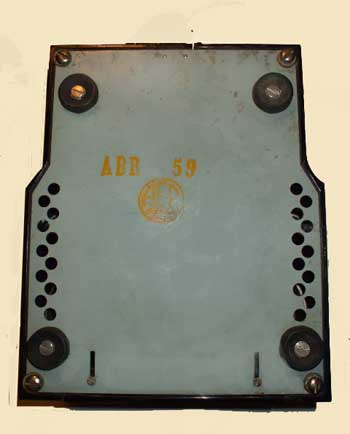 The baseplate was fairly standard between manufacturers. Some had a single row of holes along each side. The large dimple for the note tray was standard, even after it was dropped from the range. Stamps on the bottom are usually the only indicator of the manufacturer. The "H" on this one denotes ATM (used to be Helsby). The arrangement of the internal chassis is shown in the right picture.Note the two lugs at either side of the centre mounting it to the top part of the case.