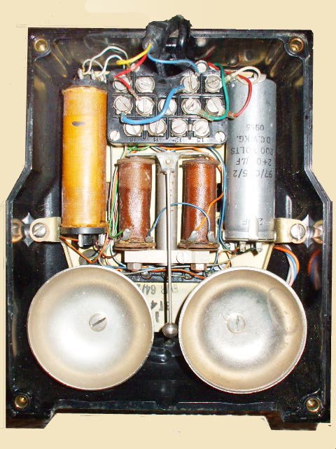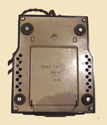 338MTH (above) is another magneto model, produced by TMC in the 1950s as stocks of magneto phones ran low. Externally it is similar to the 334MTH but inside it has a different, bigger magneto generator and a smaller bellset. Note the unusual bell gong arrangement - one vertical, one horizontal. There is also a dimpled plate mounted over a hole in the baseplate to make room for the deeper generator.
