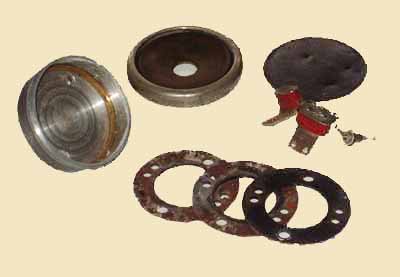 Above : The Ericsson-based receiver from the above handset. At the top is a metal ring, which on Ader receivers is called a "sur-excitateur" and served to concentrate the lines of magnetic force. Under this are two circular stamped-out magnets, with attached pole pieces brought into the centre of the receiver. A coil is fitted onto each of these pole pieces. In the use of two magnets the WE receiver differed slightly from most others who used a single magnet bent into a semicircle. From the slightly pink colour of the weathered earpiece, it looks like BTMC used ebonite (more commonly used in Europe) than Vulcanite (as used in the United States). The pink tinge was due to mercury used to harden the rubber compound.